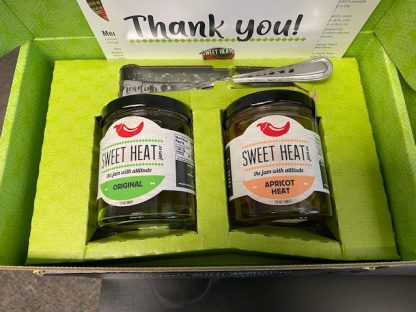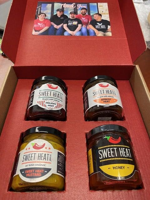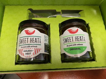 This box of deliciousness makes the perfect hostess or holiday gift. Includes 4 ounce jars of each of the following: Holiday Heat, Apricot Heat, Sweet Heat Mustard and Honey. Yum!!